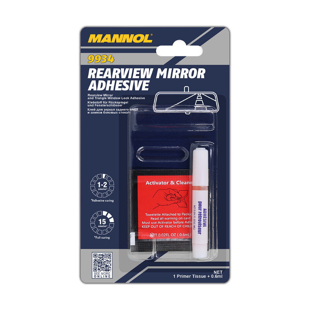 A MANNOL Rearview Mirror Adhesive 9934 egy kifejezetten autós felhasználásra fejlesztett ragasztókészlet, amelyet a belső visszapillantó tükör rögzítőtalpának, azaz a szélvédőre ragasztott fém rögzítőlapnak a visszarögzítésére terveztek. A termék célja, hogy megbízható megoldást adjon olyan helyzetekben, amikor a tükör rögzítése elenged, és a gyári rögzítési pontot gyorsan, mégis tartósan kell helyreállítani. A ragasztó nemcsak a tükörtalpakhoz használható, hanem alkalmas különféle fém alkatrészek, például zsanérok, zárak, rögzítőelemek ragasztására is az autó oldalsó ablakain és más üvegfelületein.