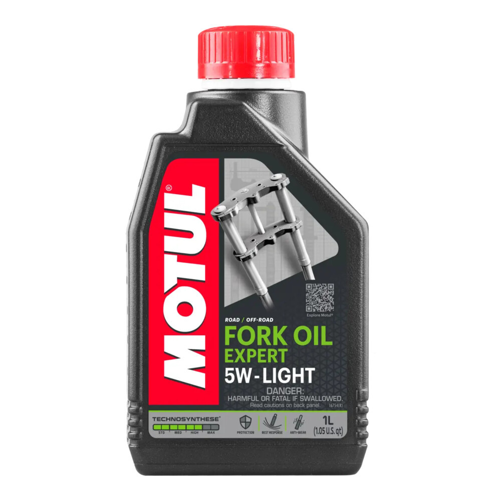 A Motul Fork Oil Expert Light 5W egy speciálisan fejlesztett hidraulikaolaj minden típusú motorkerékpár-teleszkópvillához, legyen szó hagyományos (right-side-up) vagy fordított (USD) kivitelről. A termék Technosynthese® formulája szintetikus alapolajokat és a Motul által fejlesztett, exkluzív súrlódáscsökkentő adalékot tartalmaz, amely elősegíti a villa könnyed és akadásmentes mozgását, miközben minimalizálja a belső ellenállást.